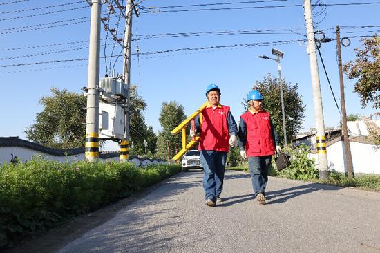 10月6日,國(guó)網(wǎng)昌吉供電公司員工走進(jìn)瑪納斯縣小海子村巡檢供電線路。沈海濤 攝