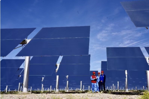 國網(wǎng)海西供電公司工作人員在青海中控德令哈50兆瓦光熱電站了解企業(yè)發(fā)電情況,助力新能源消納