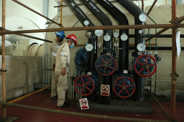 攻堅克難,保機組穩(wěn)定運行。大鵬之動,非一羽之輕也;騏驥之速,非一足之力也。盛夏的廠房內(nèi)異常悶熱,機組設備發(fā)出來的熱量讓人喘不過氣來,就在這種條件下,該廠干部職工為了快速消除缺陷,不懼困難,連續(xù)奮戰(zhàn)在現(xiàn)場??偣こ處煻诖蠹易⒁獍踩?,輪換休息,防止中暑,并協(xié)調(diào)解決工器具及材料,查看作業(yè)環(huán)境,檢查安全措施;設備部積極與哈爾濱電機廠取得聯(lián)系,請專業(yè)人員入廠探討解決方法,同時編制安全技術組織措施方案,解決設備作業(yè)過程中遇到的技術性問題,對設備作業(yè)過程中出現(xiàn)的質(zhì)量問題提出整改意見;安監(jiān)部強化監(jiān)督,從兩票控制措施執(zhí)行、腳手架及現(xiàn)場防爆行燈漏電保護器的使用情況到確認施工現(xiàn)場氫氣含量等無死角的全程檢查盯守,為消缺工作保駕護航;發(fā)電部運行人員全力配合,嚴格按照工作票所列危險點布置安全措施,開關閥門,在檢修期間密切監(jiān)視發(fā)電機風溫,發(fā)現(xiàn)問題及時對參數(shù)進行調(diào)整,在保證機組安全運行的基礎上,為消缺工作創(chuàng)造便利條件;電氣車間電機班人員分解氫冷器冷卻水出、入口法蘭短接及彎頭,在氫冷器冷卻水入口法蘭處加裝堵板,把配制好的藥液從氫冷器冷卻水出口彎頭處注滿氫冷器。工作中大家分工明確,忙而不亂,盡管現(xiàn)場氣溫高,卻沒有阻擋大家的干勁。