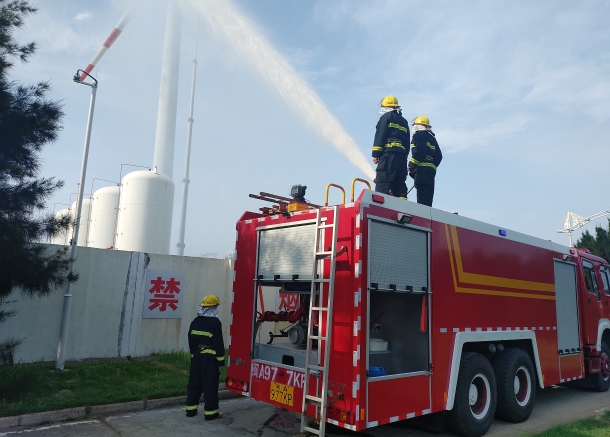 隨著一聲哨響,演練正式開始。當班值班員巡檢時在制氫站東側(cè)發(fā)現(xiàn)火情且火勢有蔓延趨勢,同時4號氫罐進出口手動閥處伴有藍色火苗,立即將情況匯報應急指揮部,隨即啟動火災事故專項應急預案。消防隊及相關(guān)人員馬上趕赴事發(fā)現(xiàn)場,開展相關(guān)救援及事后恢復工作。短短幾分鐘,保安已做好周邊人員疏散,為消防工作提供空間保障。消防水炮迅速響應,現(xiàn)場火勢及氫氣儲罐的溫度得到了有效控制,同時在運行人員與消防隊員緊密配合下,殘余火苗也被徹底撲滅,氫罐閥門泄漏及相關(guān)缺陷在檢修隊伍的協(xié)助下得以快速消除,制氫站恢復正常生產(chǎn),演練圓滿結(jié)束。