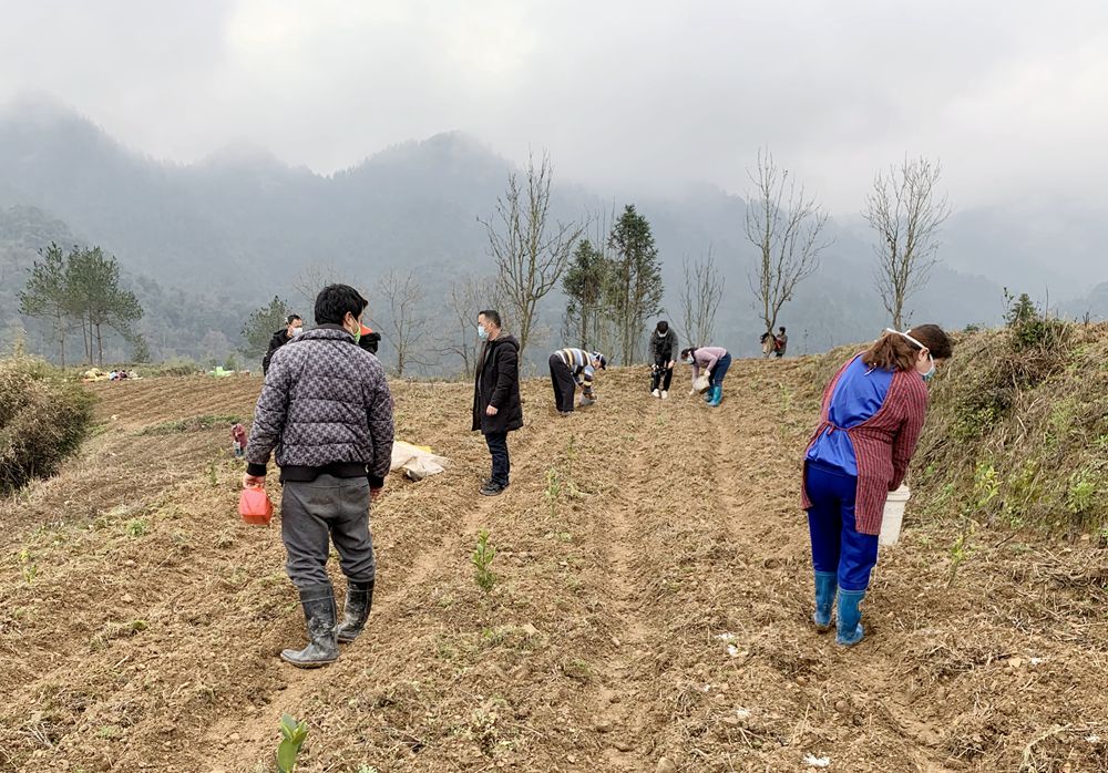 然而在村里的油茶種植基地里卻是另外一番場(chǎng)景,幾輛拖拉機(jī)來往運(yùn)送土豆種子,二十幾個(gè)村民戴著口罩在地里忙碌著,整地、挖坑、選種、澆水、施肥,一幅生機(jī)勃勃的景象。