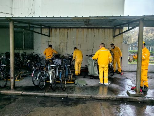 隨后,全體成員分為兩組分別對(duì)修舊利廢場(chǎng)地和自行車(chē)棚進(jìn)行分類(lèi)、歸整和清掃。大家手抬肩扛,分工明確,將各項(xiàng)物資和自行車(chē)有序定置擺放。