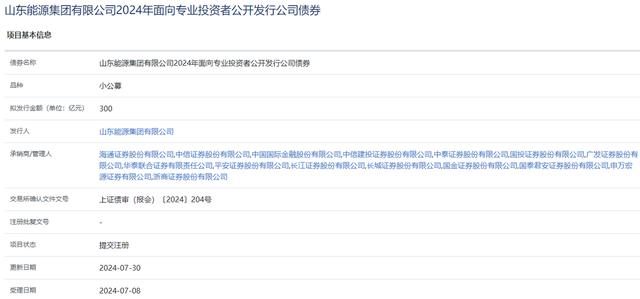 上交所債券項目信息平臺顯示,山東能源集團有限公司2024年面向專業(yè)投資者公開發(fā)行公司債券項目,最新的狀態(tài)為“提交注冊”,更新日期為2024年7月30日。