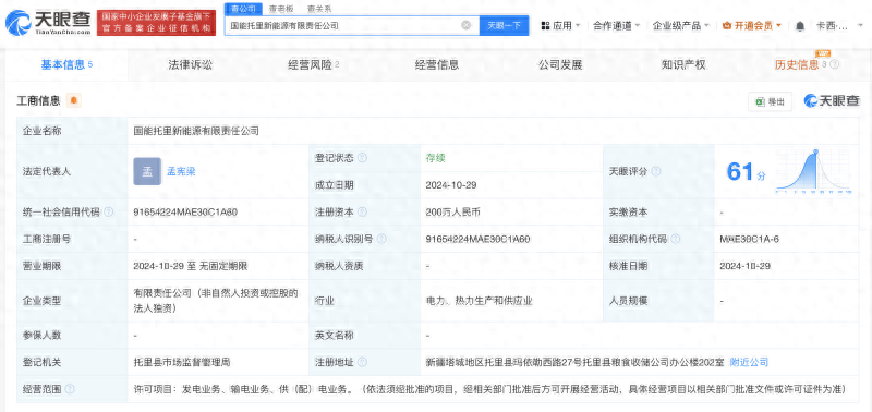 據(jù)天眼查顯示,國能托里新能源有限責(zé)任公司于近日成立,注冊資本200萬元,經(jīng)營范圍為發(fā)電業(yè)務(wù)、輸電業(yè)務(wù)、供(配)電業(yè)務(wù)。該公司由國家能源集團(tuán)新疆能源有限責(zé)任公司全資持股,后者為國家能源投資集團(tuán)有限責(zé)任公司全資子公司。