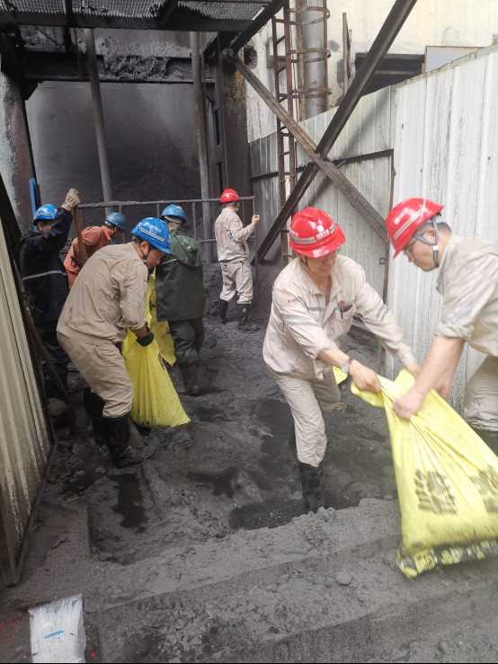 上午10時(shí),暴雨加劇,主機(jī)集控室開始大量漏水,吊頂部分塌落,下方的電子設(shè)備間漏水嚴(yán)重,部分參數(shù)失真;汽機(jī)房外的廠內(nèi)主路積水達(dá)50公分;煤溝進(jìn)水;廠前區(qū)全部停電、大門外波濤洶涌;墻外從山上下來(lái)的山洪更是濁浪排空。危急關(guān)頭,首陽(yáng)山項(xiàng)目部20余名黨員干部職工積極參與防汛行動(dòng),用沙袋堵塞缺口,加固堤壩,險(xiǎn)情逐漸消除。17時(shí),首陽(yáng)山發(fā)電公司運(yùn)煤通道路基塌方,燃煤運(yùn)輸中斷。險(xiǎn)情就是命令!面對(duì)只有兩天用量的煤炭庫(kù)存,項(xiàng)目部人員積極參與到首陽(yáng)山發(fā)電公司抗洪搶險(xiǎn)隊(duì)伍中,共筑防汛抗洪“同心堤”。經(jīng)過(guò)連續(xù)八個(gè)小時(shí)團(tuán)結(jié)奮戰(zhàn),燃煤供應(yīng)線路逐步恢復(fù),大唐人抵抗住了偃師幾十年罕見的暴雨襲擊,為地方抗洪搶險(xiǎn)、保障城市安全電力貢獻(xiàn)了力量。