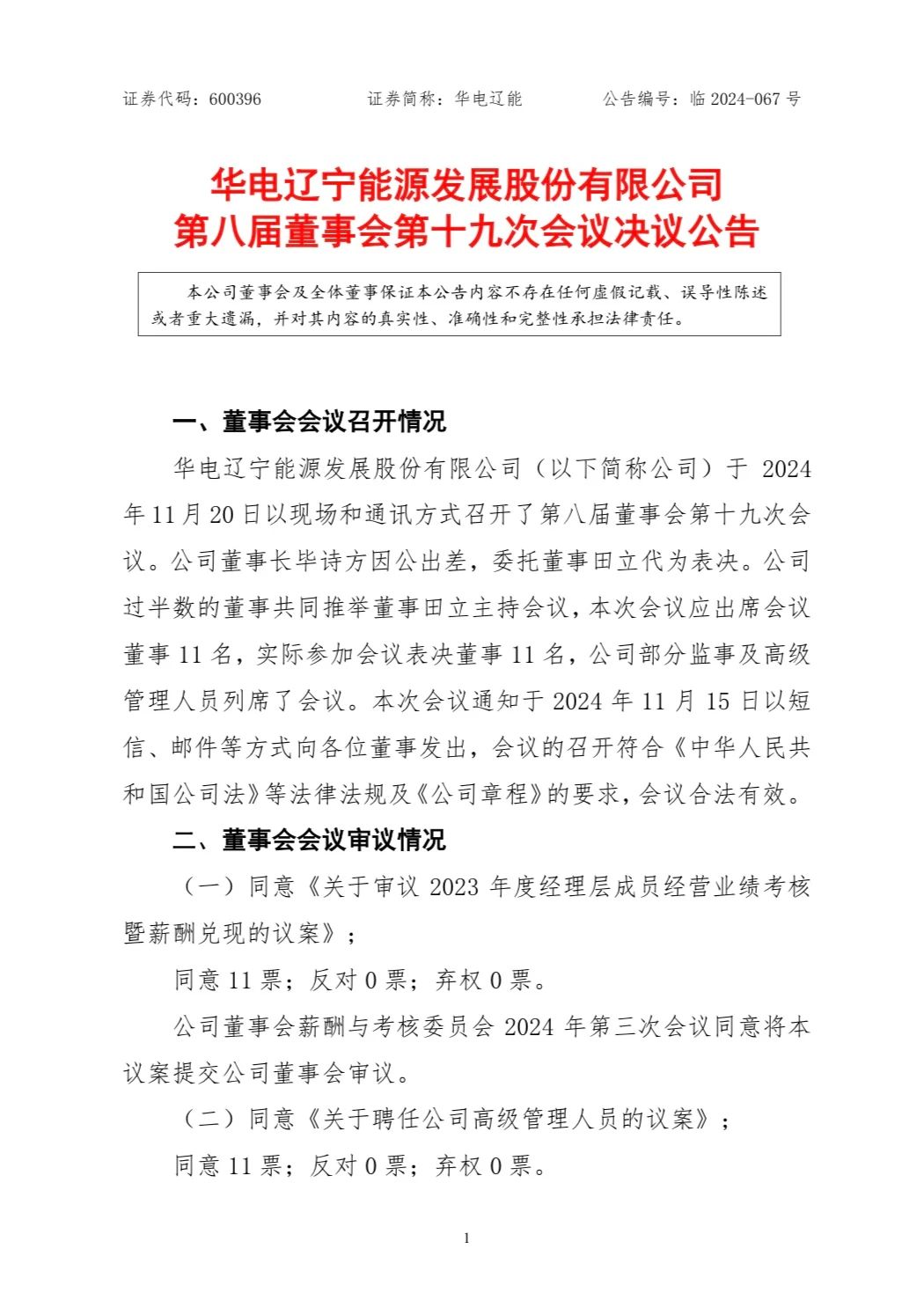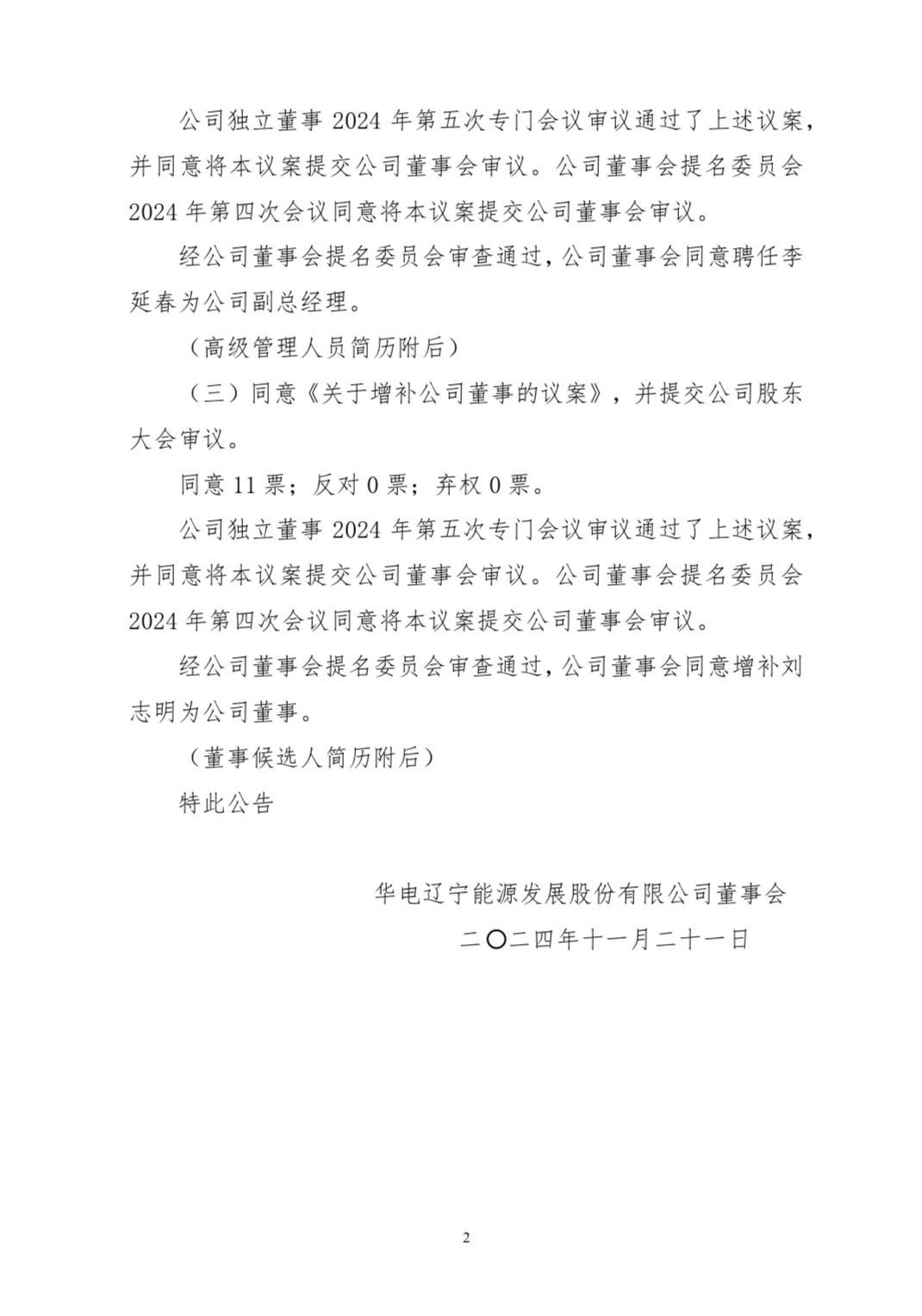 11月21日,華電遼能發(fā)布公告稱,公司于11月20日以現(xiàn)場和通訊方式召開了第八屆董事會第十九次會議,同意《關于聘任公司高級管理人員的議案》經公司董事會提名委員會審查通過,公司董事會同意聘任李延春為公司副總經理;同意《關于增補公司董事的議案》,并提交公司股東大會審議。經公司董事會提名委員會審查通過,公司董事會同意增補劉志明為公司董事。
