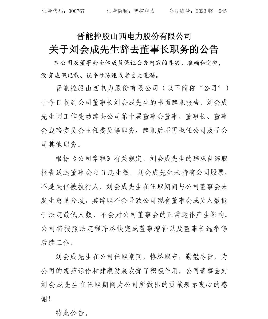 劉會(huì)成辭去晉控電力董事長(zhǎng)職務(wù)。