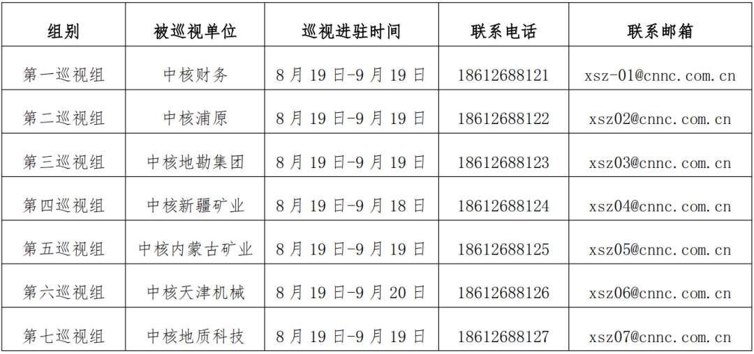 根據(jù)中核集團(tuán)黨組巡視工作統(tǒng)一部署,8月19日,黨組第一至第七巡視組分別進(jìn)駐中核財務(wù)有限責(zé)任公司、上海中核浦原有限公司、中核地質(zhì)勘查集團(tuán)有限公司、中核新疆礦業(yè)有限公司、中核內(nèi)蒙古礦業(yè)有限公司、中核(天津)機(jī)械有限公司、中核地質(zhì)科技有限公司等7家單位并召開巡視工作動員會。