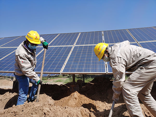 該光伏電站地處內(nèi)蒙古阿拉善烏蘭布和沙漠邊緣,現(xiàn)場土質(zhì)多為粉細(xì)砂,堅(jiān)土層較薄,不利于光伏站內(nèi)箱式變壓器、逆變器、匯流箱及光伏組串等設(shè) 備基礎(chǔ)穩(wěn)固,特別在雨季時期,雨水對光伏組件基礎(chǔ)沖刷影響較大。該公司運(yùn)維人員及時開展光伏組件基礎(chǔ)土方回填工作,現(xiàn)場采用機(jī)械填土和人工補(bǔ)填方式進(jìn)行,一邊裝載車和挖掘機(jī)配合,將土方填至光伏板背光面,另一邊人工回填光伏板正下方區(qū)域。在控制土方高度時,運(yùn)維人員嚴(yán)格按照規(guī)范要求,夯實(shí)并填平土方,保證光伏方陣組件最下端與地面距離不低于0.3米,確保光伏板受光良好。在控制加固工期期間,該公司運(yùn)維人員早出晚歸、雷厲風(fēng)行,歷時兩天,順利完成任務(wù)區(qū)的基礎(chǔ)加固工作。