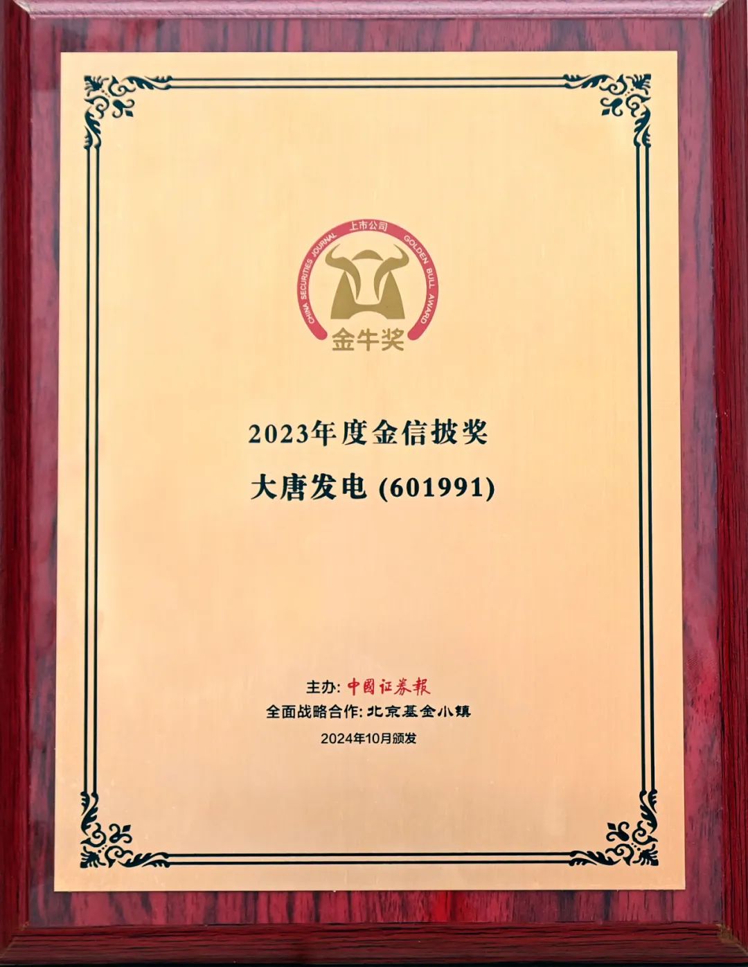 近日,2024上市公司高質(zhì)量發(fā)展論壇暨第二十六屆上市公司金牛獎頒獎典禮在江蘇南通舉行。大會期間,上市公司金牛獎9個獎項獲獎榜單揭曉。大唐發(fā)電憑借在公司治理、信息披露、投資者關(guān)系等方面工作的優(yōu)異表現(xiàn),榮獲2023年度上市公司金牛獎“金信披獎”。