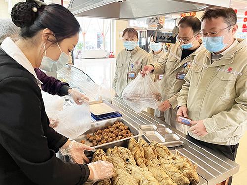 經(jīng)過大廚們精心烹制的色、香、味集于一身的各種熟食,深受職工的喜愛,供不應(yīng)求,剛一出鍋就被搶購一空。“今年的魚炸的特別香,昨天買回去兩個孩子都搶著吃,今天打算再多買幾條”“今年過年不回家了,和爸媽通了視頻電話,他們看到單位條件這么好,心里很放心”“公司為我們準備了物美價廉的‘年貨’,雖然今年堅守崗位不回家過年,卻讓我們真真切切感受到了家的溫暖,真得很暖心”大伙兒拎著買到的年貨紛紛說道。