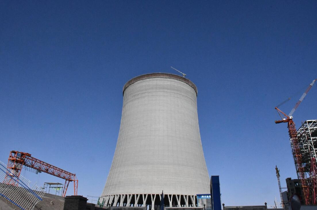 甘肅電投常樂電廠項目超大型自然通風間接空冷冷卻塔設計屬國內一流。四號塔身零米直徑為163米,塔高215米,進風口高度29米,進風口直徑143.8米。由基礎、X柱、環(huán)梁、塔筒等部分組成,于2021年7月上旬開工,X柱采用清水混凝土澆筑,整體澆筑共使用87753立方米混凝土,到頂后的間冷塔筒壁內實外光、曲線流暢、模板接茬平整。塔筒為雙曲線形現澆鋼筋混凝土殼體結構,這種設計有效解決了瓜州縣大風地區(qū)間冷塔設計和運行等技術難題。