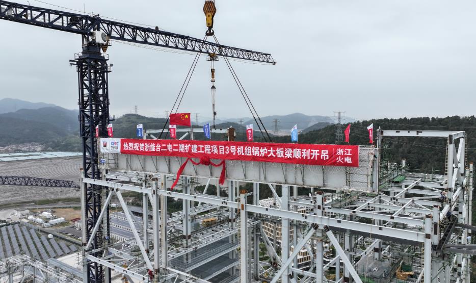 10月25日,中國能建浙江火電承建的臺二電二期項目3號機(jī)組鍋爐首根大板梁吊裝就位。