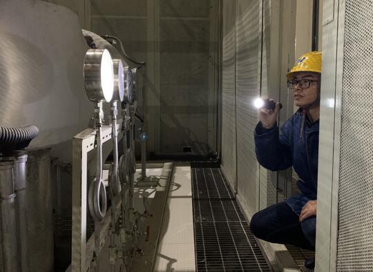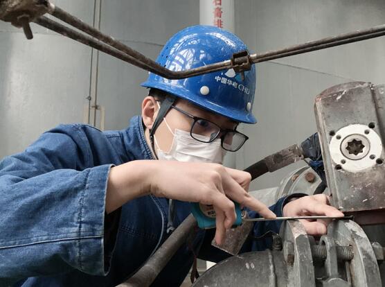 亓航正在該公司三號(hào)吸收塔B石膏排出泵排凈門檢修(圖:劉云龍)