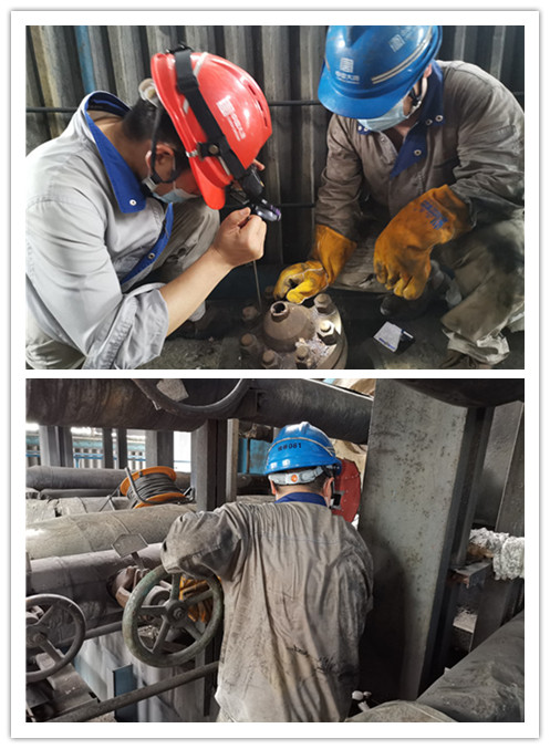 維護(hù)部:副主任與檢修人員一起檢查閥門(mén)損壞原因;綜合班副班長(zhǎng)正在焊接3號(hào)機(jī)汽包加藥管逆止門(mén)