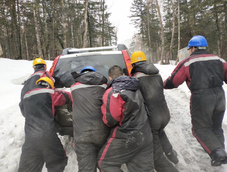 見此情形,大家拿出鐵鍬沿著車輪行駛的方向將積雪清理干凈,幾經周折,車終于從泥濘中開了出來。