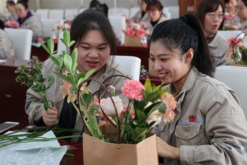 在公司“妙手生花 璽印芳華”慶“三八”創(chuàng)意插花活動(dòng)現(xiàn)場,大家正興趣盎然、興高采烈的精心制作插花作品,不時(shí)傳來陣陣歡聲笑語。