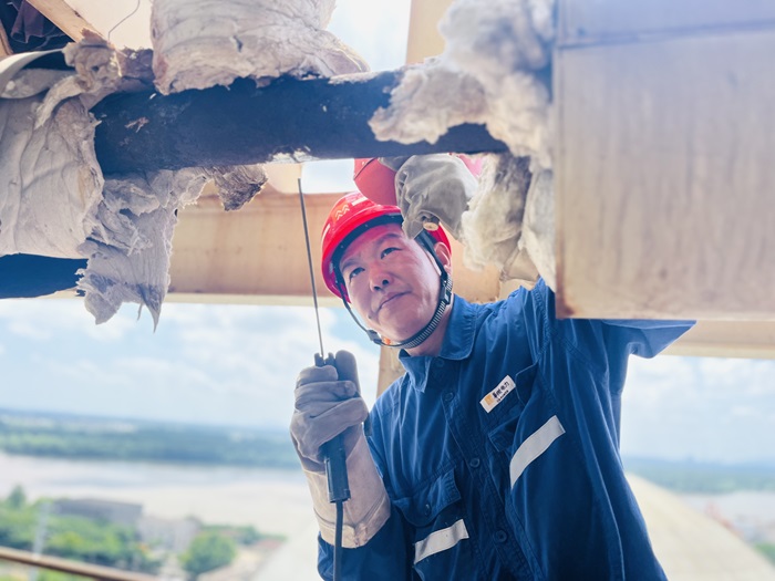 在南熱廠區(qū),老員工湯勝寶正帶領(lǐng)著他的工作小組,為鋪排管道做準(zhǔn)備工作,他還有不到一年的時(shí)間就要退休,但他仍然老當(dāng)益壯,在室外43度以上的烈日下,肩扛手抬著一根根鋼管。幾根鋼管抬放就位后,他累得滿(mǎn)臉是汗,氣喘吁吁,但他性格要強(qiáng),不服老,依然說(shuō)著:沒(méi)事,這點(diǎn)活算不了什么。