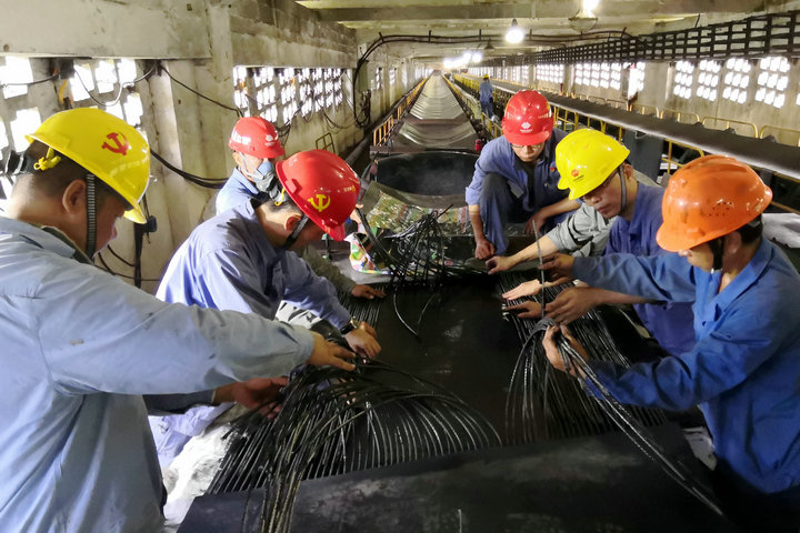 P106B膠帶整體更換膠帶全長2300米,共需硫化接頭20個,是整個輸煤系統(tǒng)膠帶更換工作中最難啃的一塊"硬骨頭"。為確保此次膠帶更換工作順利完成,該公司多次召開檢修專題討論會,制定了組織、安全、技術措施及詳細的施工方案,成立兩個硫化組,一個物資保障收放組,實行24小時輪班作業(yè),保證施工的持續(xù)性和連貫性。針對舊膠帶的拆除、拖拽、新膠帶的吊裝、鋪設等施工難點,創(chuàng)新工作思路,開展技術攻關破解難題,自制了自動卷帶機,減少了人工投入,極大提高了工作效率,特別是在攻克硫化接頭方面,嚴格施工標準和工藝流程操作,經(jīng)過斷帶、剝鋼絲繩、芯膠面膠鋪整、硫化機緊固、加壓、加熱、再進行保溫降溫等施工程序,每個頭用時8多個小時,做到精益求精,確保一次硫化成功,保證硫化質(zhì)量。