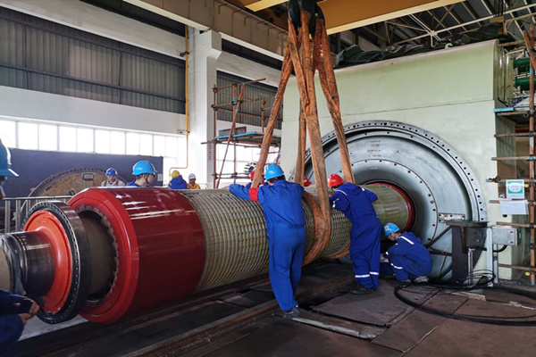 上午10時10分,隨著起重指揮人員的一聲哨響,發(fā)電機穿裝轉(zhuǎn)子工作正式開始,穿裝期間,各專業(yè)人員分工有序,密切配合,時刻注意轉(zhuǎn)子與定子的間隙,及時調(diào)整轉(zhuǎn)子的傳入量和中心位置,每一步都做到精益求精。整個穿入過程中,公司各部門負責人、專工現(xiàn)場旁站監(jiān)督,協(xié)調(diào)工作,為穿裝轉(zhuǎn)子作業(yè)的順利進行,提供了可靠保障。