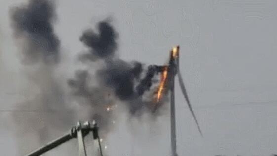 根據(jù)目擊者和消防員提供的視頻,這臺(tái)風(fēng)力渦輪發(fā)電機(jī)被雷擊中后,葉片邊旋轉(zhuǎn)邊燃燒,被燒焦后掉落,現(xiàn)場濃煙滾滾。