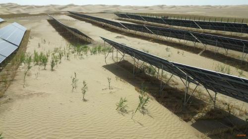 荒漠化一直是國(guó)家西部發(fā)展最大阻礙,西部治沙一直是國(guó)家的百年大計(jì),近年來(lái),國(guó)家投注了大量精力和資金治沙,一直在不斷的探索治沙新模式。光伏治沙是二十一世紀(jì)第二個(gè)十年最新探索出的成果。中國(guó)電建集團(tuán)山東電建一公司德益公司積極擔(dān)當(dāng)作為,開(kāi)展沙漠防沙固沙生態(tài)治理,在廠區(qū)迎風(fēng)面及光伏方陣,種植140萬(wàn)平草方格,即用麥草、葦桿等材料在沙漠中扎成1米乘1米的正方形方格形狀,當(dāng)氣流或風(fēng)沙流經(jīng)沙障時(shí),產(chǎn)生渦旋并伴有積沙現(xiàn)象,經(jīng)過(guò)充分蝕積,形成較為光滑凹曲面,削弱風(fēng)沙的侵蝕,有效實(shí)現(xiàn)板上發(fā)電,板下治沙改土,減緩沙丘流動(dòng),減少水分蒸發(fā),為固沙植物存活創(chuàng)造良好條件。