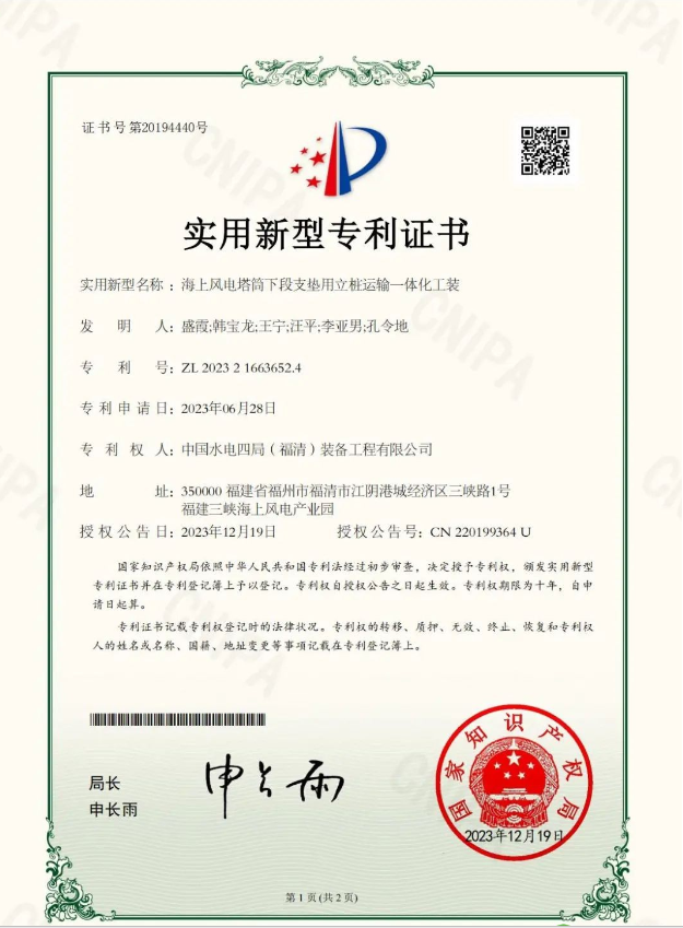 近日,由中國水電四局福清公司申報的實用新型專利《海上風電塔筒下段支墊用立樁運輸一體化工裝》順利通過國家知識產(chǎn)權(quán)局審查并獲得授權(quán)。截至目前,福清公司共獲得實用新型專利授權(quán)25項。