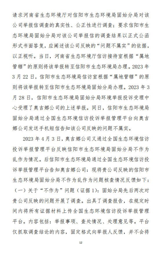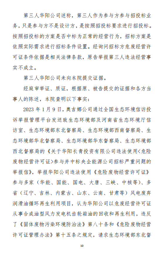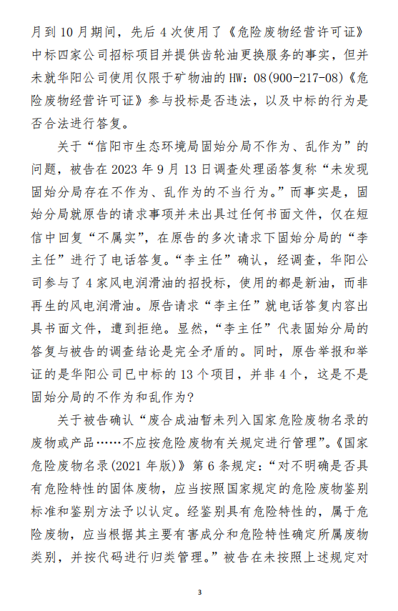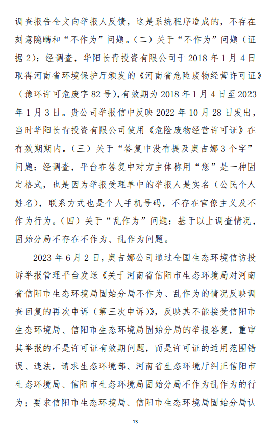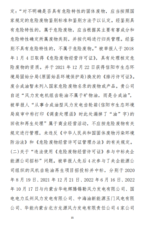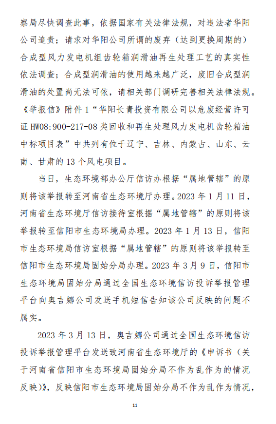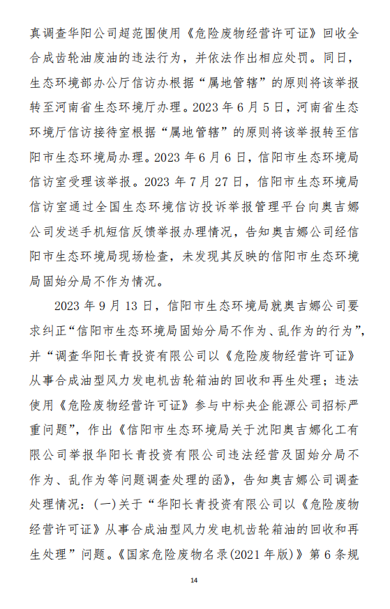2023年3月9日,奧吉娜公司收到固始分局通過12369環(huán)境信訪平臺的短信答復(fù):“反映問題不屬實”。3月10日,奧吉娜公司向固始分局負責(zé)人電話詢問,其解釋稱:經(jīng)調(diào)查核實,華陽長青公司沒有再生風(fēng)電潤滑油銷售,出售的是新油。否定了奧吉娜公司的舉報內(nèi)容。對此,奧吉娜公司表示強烈不滿。3月11日,奧吉娜公司向環(huán)境部投訴固始分局的不作為和亂作為。2023年5月26日,奧吉娜公司收到12369環(huán)境信訪平臺的短信答復(fù)。答復(fù)部門為信陽環(huán)境局。令人啼笑皆非的是,答復(fù)稱,華陽長青的許可證有效期沒有問題,與舉報內(nèi)容風(fēng)馬牛不相及。2023年6月13日,奧吉娜公司再次向環(huán)境部提出申訴,指出,奧吉娜舉報的不是許可證有效期問題,而是許可證的適用范圍錯誤、違法。2023年7月27日,奧吉娜公司收到回復(fù)稱,經(jīng)信陽市生態(tài)環(huán)境局現(xiàn)場檢查,未發(fā)現(xiàn)固始分局不作為情況。2023年8月3日,奧吉娜公司向河南省生態(tài)環(huán)境廳(以下稱:環(huán)境廳)舉報信陽環(huán)境局包庇固始分局的行為。環(huán)境廳對此高度重視,有關(guān)處長和奧吉娜公司負責(zé)人進行了面談。2023年9月13日,信陽環(huán)境局向奧吉娜公司致《信陽市生態(tài)環(huán)境局關(guān)于沈陽奧吉娜化工有限公司舉報華陽長青投資有限公司違法經(jīng)營及固始分局不作為、亂作為等問題調(diào)查處理的函》。函中:一是,以“齒輪箱”替換“齒輪箱油”,偷換概念;二是,做出了廢風(fēng)電合成(齒輪)油不屬于危險廢物的結(jié)論;三是,未發(fā)現(xiàn)固始分局存在不作為、亂作為的不當(dāng)行為。再次否定奧吉娜公司的舉報和投訴。