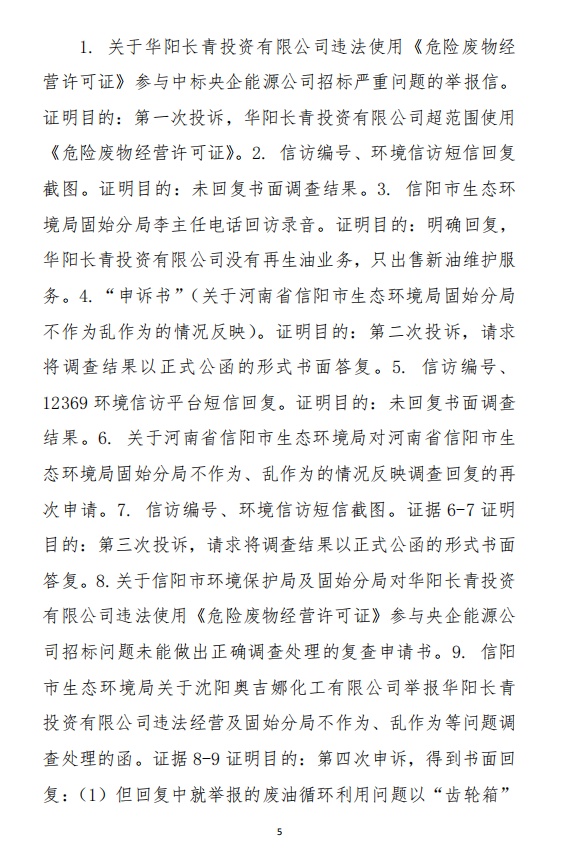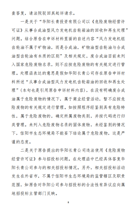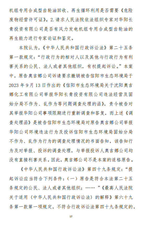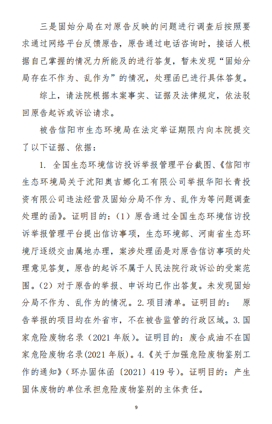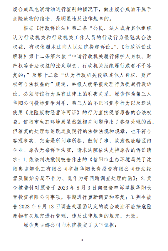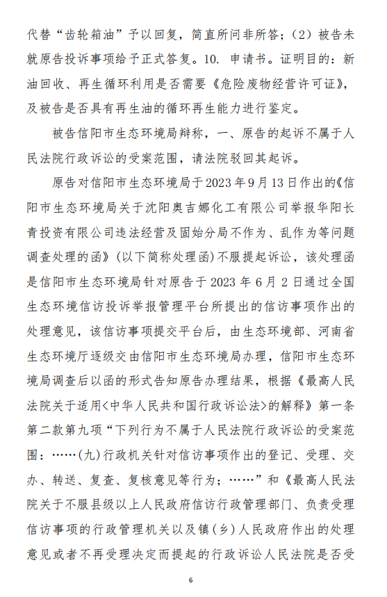 2、訴訟請求:請求人民法院判決撤銷被告作出的《信陽市生態(tài)環(huán)境局關(guān)于沈陽奧吉娜化工有限公司舉報華陽長青投資有限公司違法經(jīng)營及固始分局不作為、亂作為等問題調(diào)查處理的函》;責(zé)令被告對原告向被告舉報華陽長青投資有限公司事項,限期進行重新調(diào)查和答復(fù);判令被告認定的廢合成油不應(yīng)按危險廢物有關(guān)規(guī)定進行管理違反法律規(guī)章規(guī)定,無效。