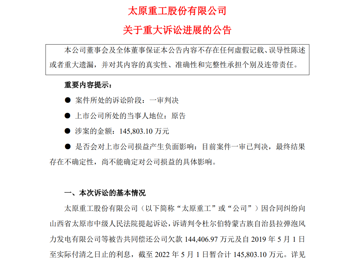 公告披露,太原重工因合同糾紛向山西省太原市中級人民法院提起訴訟,訴請判令杜爾伯特蒙古族自治縣拉彈泡風(fēng)力發(fā)電有限公司(以下簡稱“拉彈泡公司”)等被告共同償還公司欠款144,406.97萬元及自2019年5月1日至實(shí)際付清之日止的利息,截至2022年5月1日暫合計(jì)145,803.10萬元。