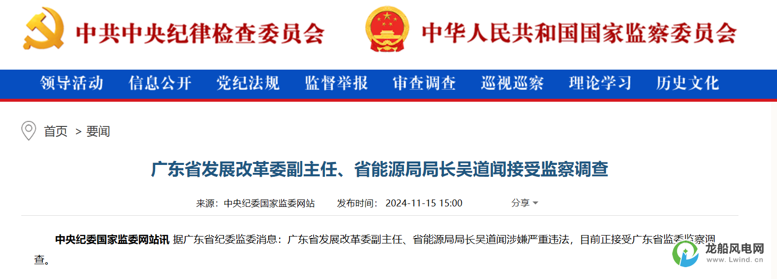 11月15日,中央紀委國家監(jiān)委網(wǎng)站訊 據(jù)廣東省紀委監(jiān)委消息:廣東省發(fā)展改革委副主任、省能源局局長吳道聞涉嫌嚴重違法,目前正接受廣東省監(jiān)委監(jiān)察調(diào)查。