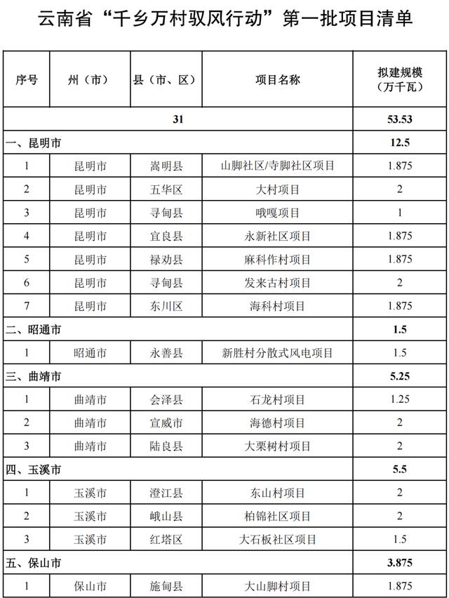 為持續(xù)打造綠色能源強省、大力發(fā)展新能源、助力鄉(xiāng)村振興,云南近日發(fā)布《“千鄉(xiāng)萬村馭風(fēng)行動”第一批項目開發(fā)建設(shè)方案》(以下簡稱《方案》),將開發(fā)建設(shè)第一批共31個風(fēng)電項目,裝機(jī)容量53.53萬千瓦。