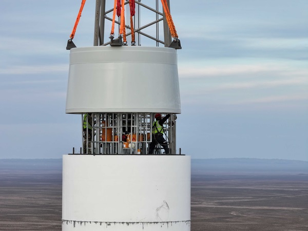 該首臺(tái)套風(fēng)電機(jī)組并網(wǎng),標(biāo)志著全球規(guī)?;逃米畲蠡焖L(fēng)力發(fā)電機(jī)組在內(nèi)蒙古能源集團(tuán)成功發(fā)電運(yùn)行。項(xiàng)目使用的風(fēng)電設(shè)備單機(jī)容量10兆瓦,混塔高134.4米,整機(jī)高度140米,葉片長(zhǎng)112米,風(fēng)輪直徑230米,覆蓋及掃風(fēng)面積更大,經(jīng)濟(jì)性和發(fā)電量相對(duì)更高。值得一提的是,此項(xiàng)目風(fēng)機(jī)塔筒由鋼筋混凝土中空、重力式基礎(chǔ)+上部高強(qiáng)混凝土預(yù)制管片疊合而成,是國內(nèi)首次采用內(nèi)張拉、預(yù)應(yīng)力技術(shù)的10兆瓦混塔風(fēng)力發(fā)電項(xiàng)目。塔筒內(nèi)部預(yù)留孔洞固定鋼纜,鋼纜固定后進(jìn)行水泥灌漿填充縫隙,風(fēng)機(jī)運(yùn)行中旋轉(zhuǎn)產(chǎn)生擺動(dòng),使用此技術(shù),在擺動(dòng)時(shí),塔筒內(nèi)部結(jié)構(gòu)均勻受力,整體擺幅程度大大降低,使塔筒整體性更好、耐久性更強(qiáng)、預(yù)應(yīng)力損失小,混塔結(jié)構(gòu)塔筒優(yōu)勢(shì)突出。