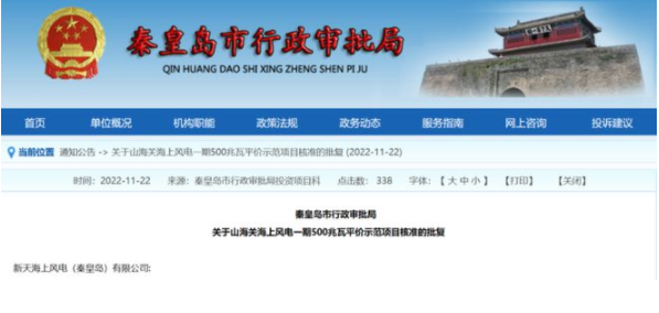 日前,河北秦皇島市行政審批局發(fā)布《關(guān)于山海關(guān)海上風(fēng)電一期500兆瓦平價示范項目核準(zhǔn)的批復(fù)》,同意建設(shè)該項目。