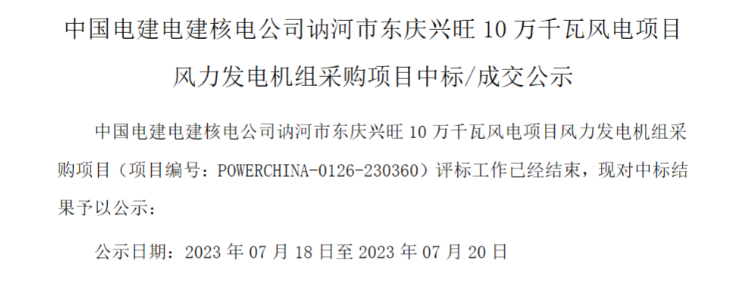 7月18日,中國電建集中采購平臺(tái)發(fā)布《中國電建電建核電公司訥河市東慶興旺10萬千瓦風(fēng)電項(xiàng)目風(fēng)力發(fā)電機(jī)組采購項(xiàng)目中標(biāo)/成交公示》的公告。