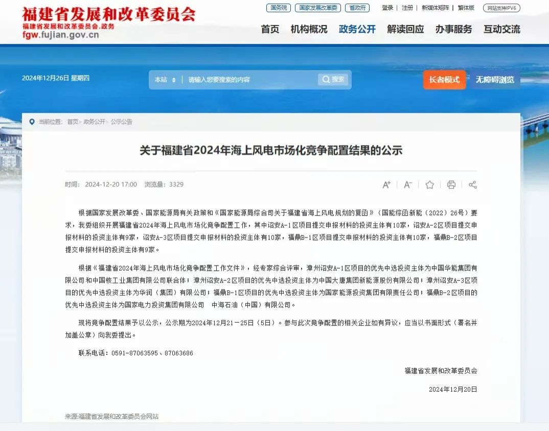 12月26日,國家電投集團福建電力有限公司在福建省2024年海上風電市場化競爭配置工作中,與中海石油(中國)有限公司共同取得福鼎B-2區(qū)70萬千瓦海上風電競配指標。