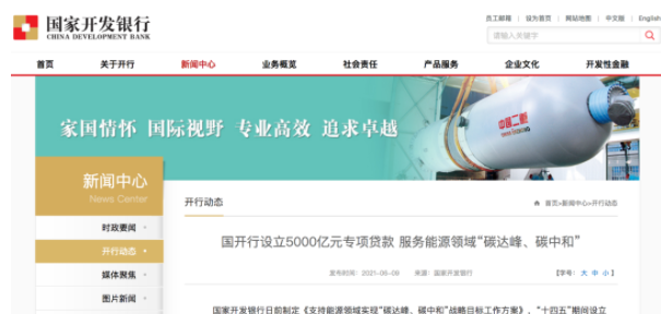 近期,國家開發(fā)銀行制定《支持能源領(lǐng)域?qū)崿F(xiàn)“碳達(dá)峰、碳中和”戰(zhàn)略目標(biāo)工作方案》,“十四五”期間設(shè)立總規(guī)模為5000億元(等值人民幣,含外匯)的能源領(lǐng)域“碳達(dá)峰、碳中和”專項貸款,其中2021年安排發(fā)放1000億元,助力構(gòu)建清潔低碳安全高效的能源體系。