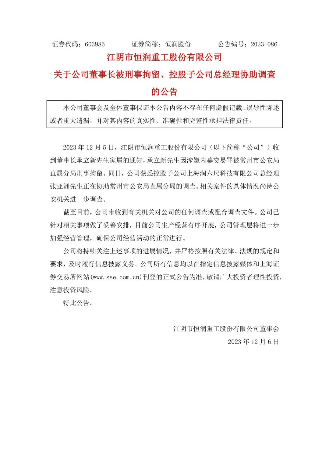 公告顯示, 2023 年 12 月 5 日,江陰市恒潤(rùn)重工股份有限公司(以下簡(jiǎn)稱“公司”)收到董事長(zhǎng)承立新先生家屬的通知,承立新先生因涉嫌內(nèi)幕交易罪被常州市公安局直屬分局刑事留。同日,公司獲悉控股子公司上海潤(rùn)六尺科技有限公司總經(jīng)理張亞洲先生正在協(xié)助常州市公安局直屬分局的調(diào)查。相關(guān)案件的具體情況尚待公安機(jī)關(guān)進(jìn)一步調(diào)查。