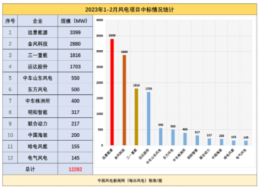 據(jù)每日風(fēng)電統(tǒng)計(jì),2023年1-2月,59個風(fēng)電項(xiàng)目的中標(biāo)情況顯示,已開標(biāo)項(xiàng)目總規(guī)模達(dá)12282MW,涉及12家整機(jī)商。
