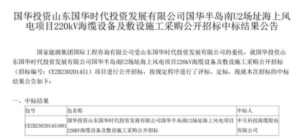 近日,國(guó)家能源招標(biāo)網(wǎng)發(fā)布《國(guó)華投資山東國(guó)華時(shí)代投資發(fā)展有限公司國(guó)華半島南U2場(chǎng)址海上風(fēng)電項(xiàng)目220kV海纜設(shè)備及敷設(shè)施工采購(gòu)公開招標(biāo)中標(biāo)結(jié)果公告》。公告顯示,中天科技海纜股份有限公司成功中標(biāo)該項(xiàng)目,中標(biāo)價(jià)格為42111.942000萬元。
