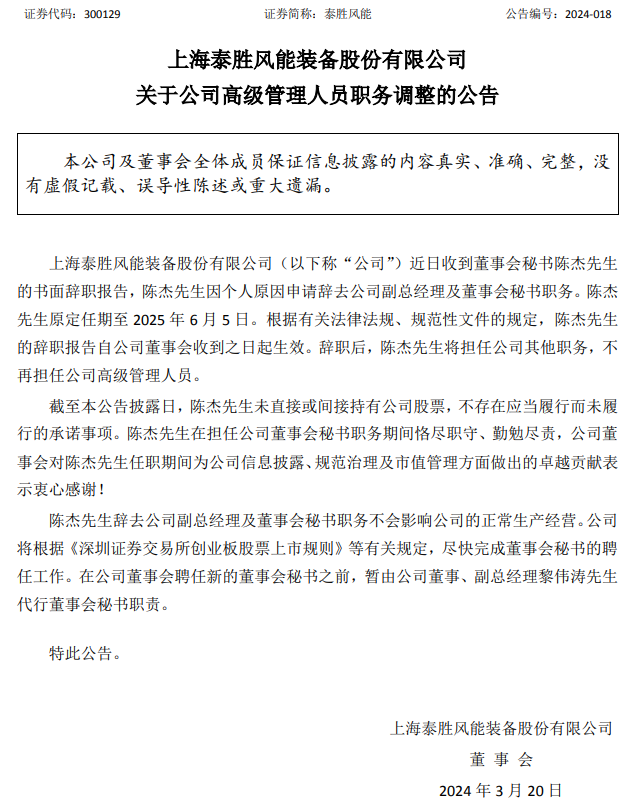 3月20日,上海泰勝風(fēng)能裝備股份有限公司(簡(jiǎn)稱:泰勝風(fēng)能)發(fā)布關(guān)于公司高級(jí)管理人員職務(wù)調(diào)整的公告。