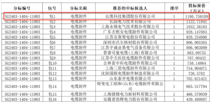 電纜附件一共16包,長纜科技中標(biāo)包1,報價為1186.759109萬元,中標(biāo)金額居16家中標(biāo)廠商中第一位置。
