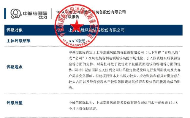 中誠信,作為業(yè)內(nèi)公認的頂級信用評級機構,其評級體系嚴謹而公正。泰勝風能憑借在風電裝備制造市場的龍頭地位、生產(chǎn)基地的戰(zhàn)略性布局及碼頭資源的獨特優(yōu)勢,贏得了中誠信的高度贊譽。公司穩(wěn)健的利潤增長、科學的財務結構、雄厚的資本實力以及清晰而廣闊的發(fā)展藍圖,共同構筑了“AA+”評級的堅實基石。