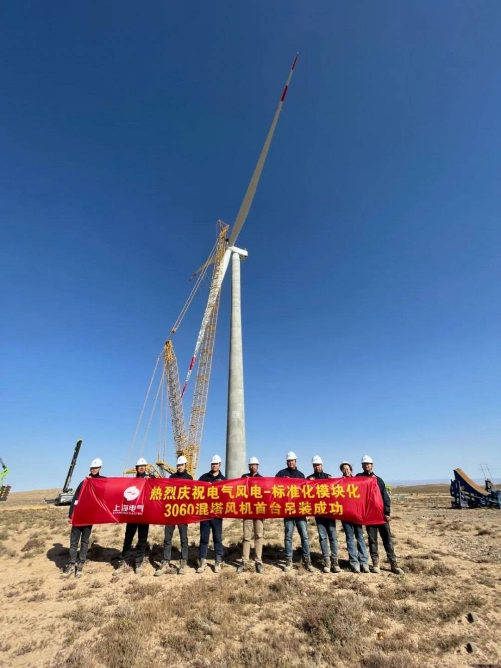 近年來(lái),混塔(鋼-混凝土混合塔架)憑借著剛度大、安全穩(wěn)定性高、原材料成本低等各項(xiàng)優(yōu)勢(shì)在風(fēng)切變指數(shù)較高的低風(fēng)速地區(qū)得到了廣泛應(yīng)用,為用戶帶來(lái)了明顯的收益、得到了用戶的普遍認(rèn)可。2022年10月21日,電氣風(fēng)電首臺(tái)自研自制的標(biāo)準(zhǔn)化、模塊化“3060混塔”型風(fēng)電機(jī)組卓刻平臺(tái)WH6.25N-182,在甘肅省金昌市潮水山戈壁灘順利完成吊裝。該機(jī)組的順利吊裝標(biāo)志著:電氣風(fēng)電自研混塔正式進(jìn)入批量商業(yè)化應(yīng)用階段。