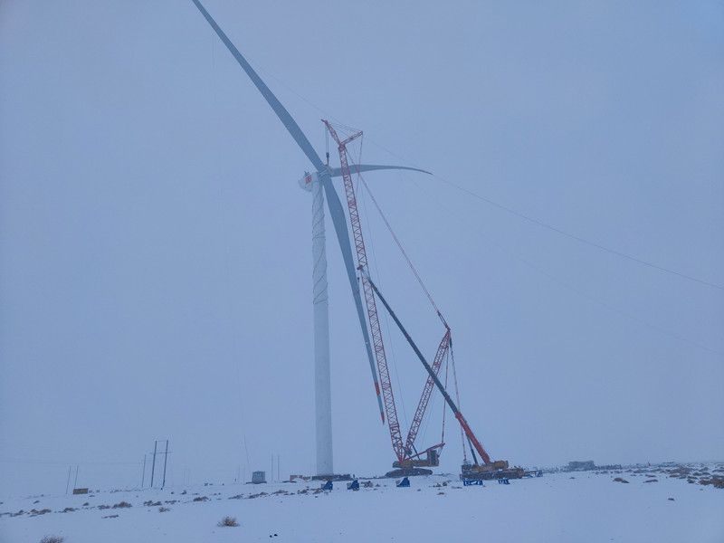 11月27日,在最后一臺風(fēng)機的吊裝現(xiàn)場,面對施工環(huán)境的變化和溫度驟降,現(xiàn)場的吊裝工作人員顯得格外謹慎,伴隨著對講機中不斷傳來的指令,主吊司機小心翼翼撥動著操縱桿,司索工有的放矢牽引著纜風(fēng)繩,安裝工井然有序,所有人不懼嚴寒堅守在各自崗位上,將巨大的風(fēng)機葉輪緩緩吊起;到達指定高度后,原本平行的葉輪逐漸轉(zhuǎn)為垂直并緩慢地向主機艙靠近;經(jīng)過多次精準的調(diào)整,風(fēng)機葉輪終于與主機實現(xiàn)完美對接……吊裝團隊在經(jīng)歷了50多個小時的緊張作業(yè)后,風(fēng)機像一位全副武裝的鋼鐵巨人張開臂膀屹立在天地之間,在隨風(fēng)飄蕩的雪花和不遠處其他小型風(fēng)機的襯托下,更顯現(xiàn)出它的挺拔宏偉。