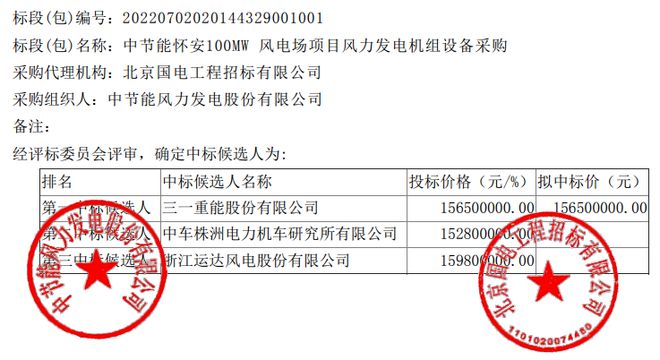 1月28日,中節(jié)能平臺發(fā)布《中節(jié)能懷安100MW風(fēng)電場項目風(fēng)力發(fā)電機(jī)組設(shè)備采購》中標(biāo)候選人公示,三一重能預(yù)中標(biāo),投標(biāo)報價15650萬元。