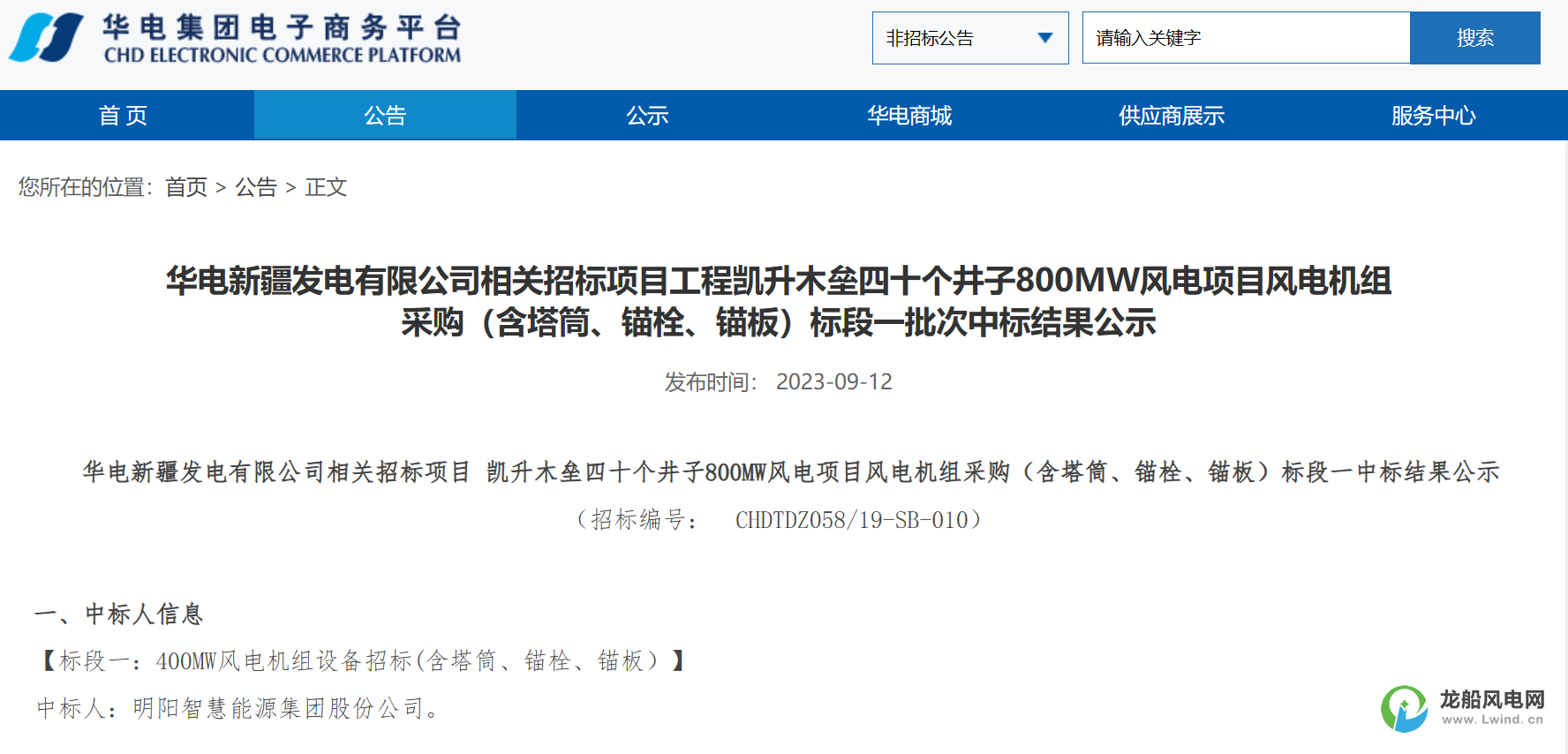 公告顯示,明陽智慧能源集團股份公司成功中標標段一,中標價格為59480.000000萬元。