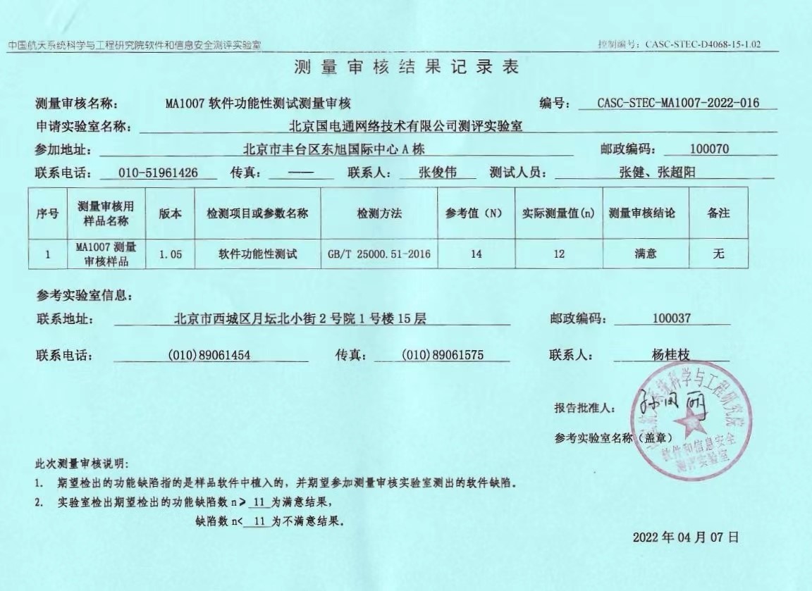 CNAS是由國(guó)家認(rèn)證認(rèn)可監(jiān)督管理委員會(huì)批準(zhǔn)設(shè)立并授權(quán)的國(guó)家認(rèn)可機(jī)構(gòu),統(tǒng)一負(fù)責(zé)對(duì)認(rèn)證機(jī)構(gòu)、實(shí)驗(yàn)室和檢驗(yàn)機(jī)構(gòu)等相關(guān)機(jī)構(gòu)的認(rèn)可工作。獲得測(cè)評(píng)實(shí)驗(yàn)室認(rèn)可(CNAS)資質(zhì),則表明具備了可自主開(kāi)展出廠測(cè)試工作的能力。3月22日至4月2日,信產(chǎn)國(guó)電通測(cè)評(píng)實(shí)驗(yàn)室報(bào)名參與中國(guó)航天科技集團(tuán)有限公司軟件評(píng)測(cè)中心組織開(kāi)展的軟件功能性測(cè)量審核。在測(cè)量審核過(guò)程中,信產(chǎn)國(guó)電通檢測(cè)人員精心組織,嚴(yán)格按照作業(yè)指導(dǎo)書(shū)及軟件功能性測(cè)試技術(shù)標(biāo)準(zhǔn)規(guī)范的要求,認(rèn)真開(kāi)展檢測(cè)工作,成功在規(guī)定時(shí)間內(nèi)反饋出檢測(cè)結(jié)果報(bào)告單和原始記錄。經(jīng)中國(guó)航天科技集團(tuán)有限公司軟件評(píng)測(cè)中心認(rèn)定,本次測(cè)量審核結(jié)果為“滿(mǎn)意”。