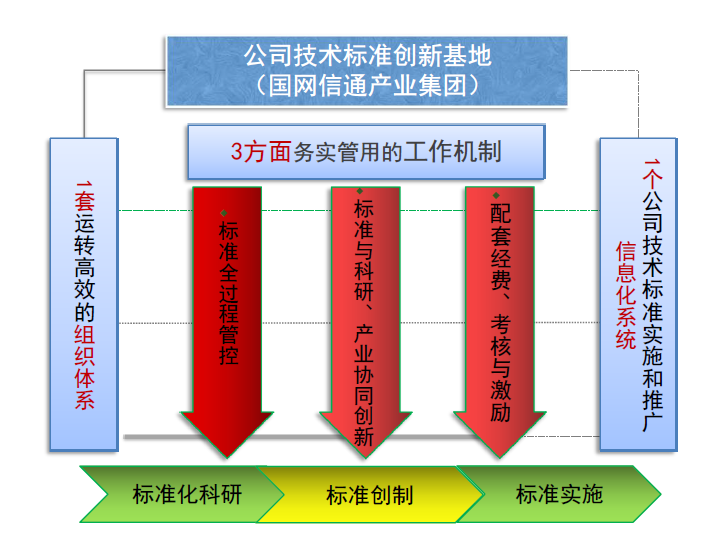 該創(chuàng)新基地基于2019籌建工作基礎(chǔ),進(jìn)一步健全了“1+3+1”組織體系和工作機(jī)制(即:以搭建一套運(yùn)轉(zhuǎn)高效的組織體系為核心,以構(gòu)設(shè)“標(biāo)準(zhǔn)全過程管控,標(biāo)準(zhǔn)與科研、產(chǎn)業(yè)協(xié)同創(chuàng)新,配套經(jīng)費(fèi)、考核與激勵(lì)”三方面務(wù)實(shí)管用的工作機(jī)制為抓手,以建設(shè)完善一個(gè)公司技術(shù)標(biāo)準(zhǔn)實(shí)施和推廣信息化系統(tǒng)為依托,統(tǒng)籌推進(jìn)創(chuàng)新基地各項(xiàng)任務(wù))。完善“標(biāo)準(zhǔn)全過程管控,標(biāo)準(zhǔn)與科研、產(chǎn)業(yè)協(xié)同創(chuàng)新,配套經(jīng)費(fèi)、考核與激勵(lì)”三方面工作機(jī)制。搭建了國家電網(wǎng)公司技術(shù)標(biāo)準(zhǔn)體系本地?cái)?shù)據(jù)庫和技術(shù)標(biāo)準(zhǔn)實(shí)施評價(jià)信息化平臺,完成公司制度標(biāo)準(zhǔn)智能管理平臺建設(shè),構(gòu)建了首個(gè)電力行業(yè)標(biāo)準(zhǔn)與制度知識圖譜庫,初步形成“電網(wǎng)全業(yè)務(wù)神經(jīng)網(wǎng)絡(luò)”