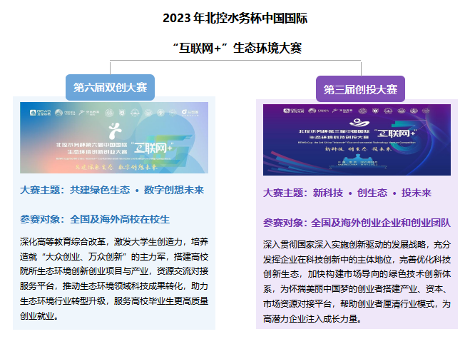 目前,北控水務(wù)杯第六屆中國(guó)國(guó)際“互聯(lián)網(wǎng)+”生態(tài)環(huán)境創(chuàng)新創(chuàng)業(yè)大賽(以下簡(jiǎn)稱“雙創(chuàng)大賽”)和第三屆中國(guó)國(guó)際“互聯(lián)網(wǎng)+”生態(tài)環(huán)境科技創(chuàng)投大賽(以下簡(jiǎn)稱“創(chuàng)投大賽”)兩場(chǎng)賽事報(bào)名通道已在北控水務(wù)集團(tuán)官網(wǎng)(http://www.bewg.net/)正式開(kāi)啟,報(bào)名截止日期為2023年10月10日,并擬定于12月初在南京大學(xué)舉辦現(xiàn)場(chǎng)總決賽。